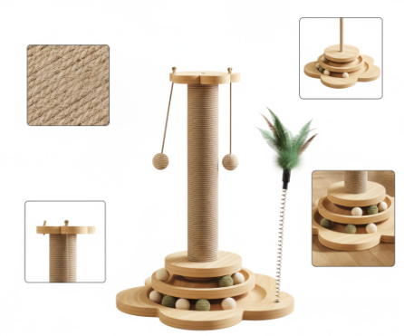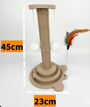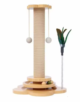 Este produto é um arranhador completo e um centro de atividades, projetado para satisfazer os instintos naturais do seu gato de arranhar, caçar e brincar. Com um design elegante em madeira clara, ele se integra facilmente à decoração da casa, proporcionando um espaço dedicado para a diversão e o bem-estar do seu felino.