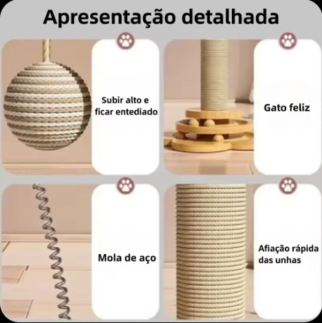 Pista de Bolas na Base: A base em camadas funciona como uma pista de bolas integrada. Em um nível rebaixado, há várias bolas soltas (algumas de sisal, outras lisas) que o gato pode empurrar e perseguir, mantendo-o entretido por longos períodos. O design impede que as bolas saiam facilmente da pista.
