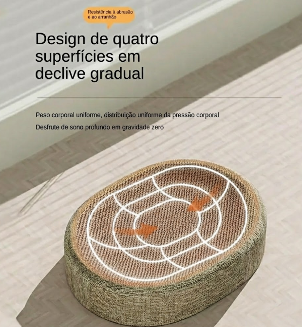 Dupla Função: Funciona perfeitamente como uma cama, onde o gato pode se enrolar e dormir confortavelmente nas bordas elevadas, e também como um arranhador horizontal, satisfazendo a necessidade de afiar as unhas no mesmo local de descanso.